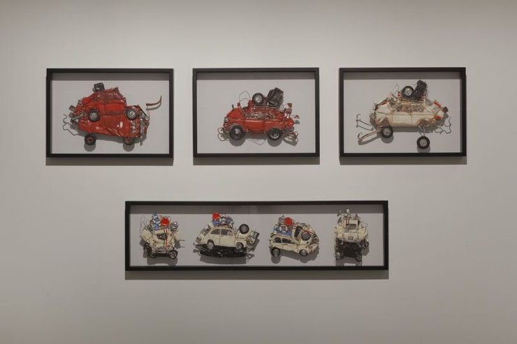 Zgniecione pojazdy otoczone są drewnianą, profilowaną ramą, formą używaną do kształtowania i dopasowywania metalowych paneli 500, wykonana w 1956 roku przez zespół Dante Giacosa i wypożyczoną z Archiwum i Muzeum Fiata.